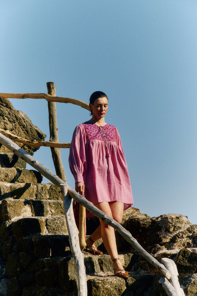 The Maquis Dress combines delicate violet stripes with an elegant Indian-inspired motif for a unique and charming look