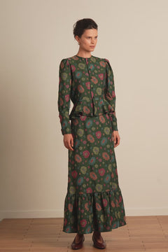 A romantic floral blouse with a sculpted silhouette and vintage flair