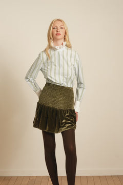 The Bisou Shirt adds a delicate touch to your wardrobe with its soft kaki and red striped cotton and elegant ruffled details